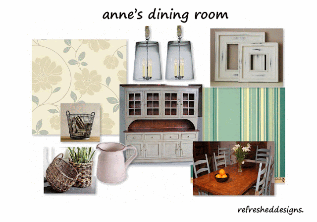 And below you can see the design board for her dining room, with the painted hutch as a key component. I like the idea of painting most of it in a distressed off-white, and leaving the top as is. Her home is rustic country style, and budget is low, so that means painting the existing blond wood table and chairs as well. I suggest staining the table to match the wood left on the hutch, which is dark. And the chairs would be painted a light blue. This will flow with the wallpaper and with the adjoining kitchen, where the countertops are blue. The floral paper is wallpaper from Home Depot, and the striped fabric from Kravet is for a table runner and possibly cushions for the dining chairs. I love these simple lights for above the table, and she has many great baskets and a pitcher collection to display.
