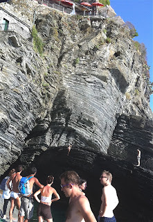 Since it was so hot today (low 100s and very humid), I opted for a train ride back south to Vernazza instead of hiking the trail between the two towns. I've seen lots of photos of this little village by the sea, so I was a bit disappointed to find most of the "charming" homes on the cliffs in need of a good paint job. And Vernazza is really, really small!