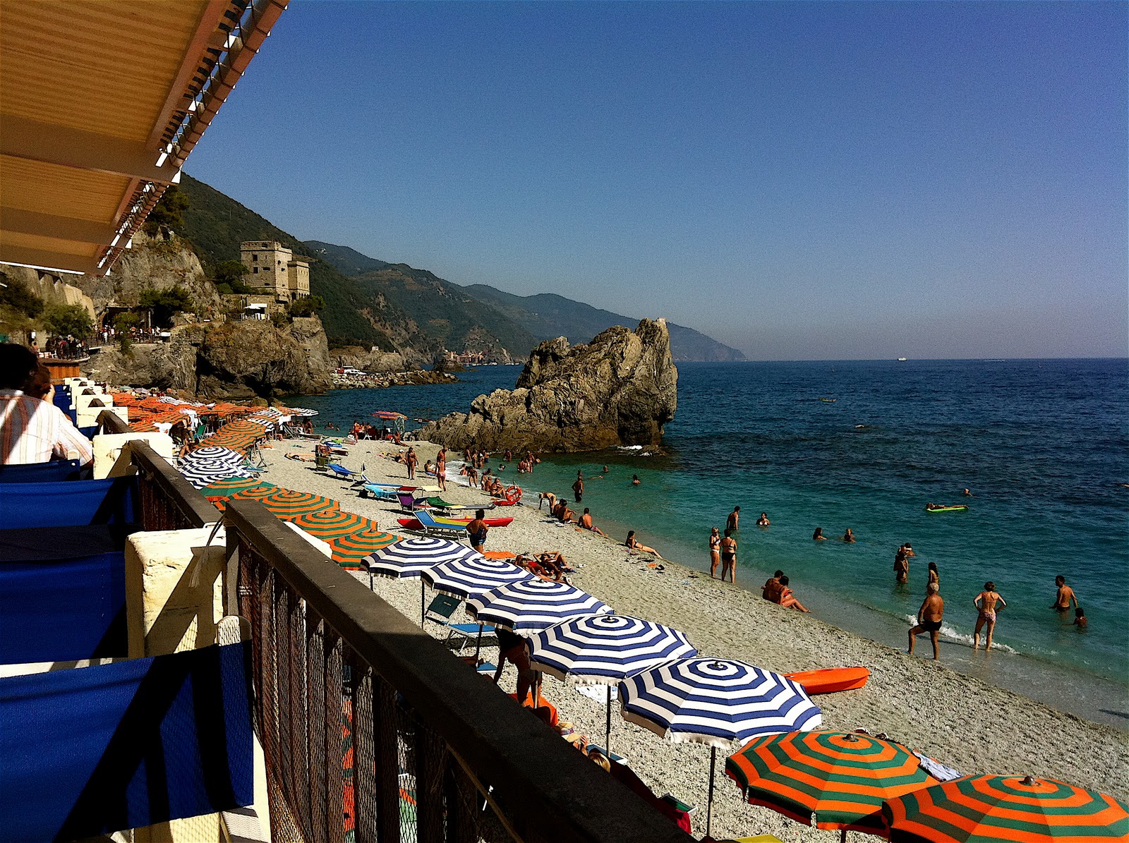 Today was my opportunity to travel a bit and visit the Cinque Terre ("five lands"), which were packed with tourists, naturally. It took a few hours to travel by train from Lucca to Monterosso, which was a fine place for a late lunch. The picture above shows my view from a lunch table at one of the cafes along the beach. I also walked all over the town, but all I really saw was lots of little souvenir shops, cheap eateries and hotels/rooms for rent.