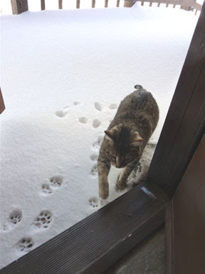Ivy wanted to go out, and normally I don't allow it (coyotes in the neighborhood, not to mention the bobcat who owns the territory where my house is situated). But I had a feeling she'd come right back inside, and I was right about that. Ivy isn't too keen on getting her paws wet!